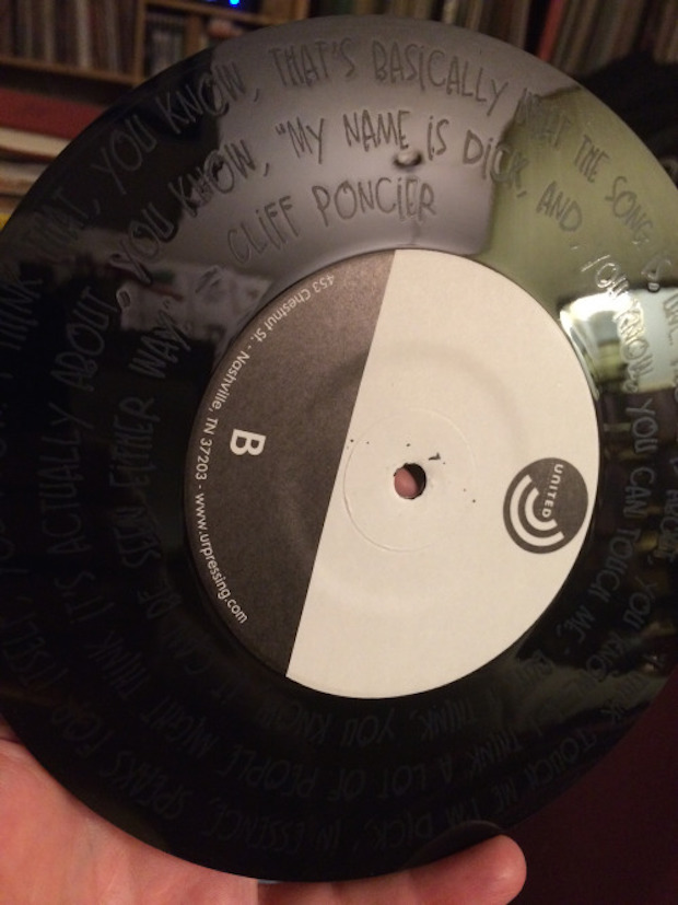 Citizen Dick, the fictional grunge band featured in Cameron Crowe's 1992 film Singles, is getting a 7-inch release for Record Store Day. The vinyl will feature "Touch Me I'm Dick" -- the full version of which surfaced a few years ago --on the A-side and an etching of a quote from the film on the B-side. The "real" Citizen Dick features Eddie Vedder, Stone Gossard, and Jeff Ament of Pearl Jam. It'll be out on 4/18 via Legacy Recordings with the rest of the Record Store Day releases. Check out the artwork for the B-side below.