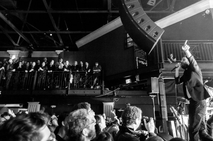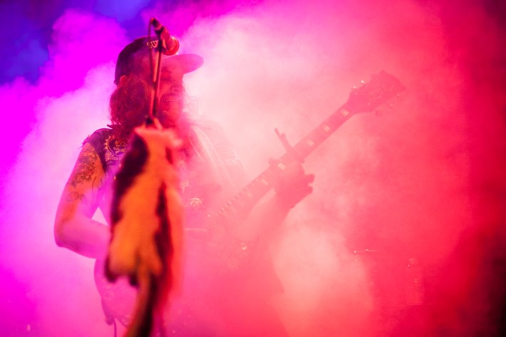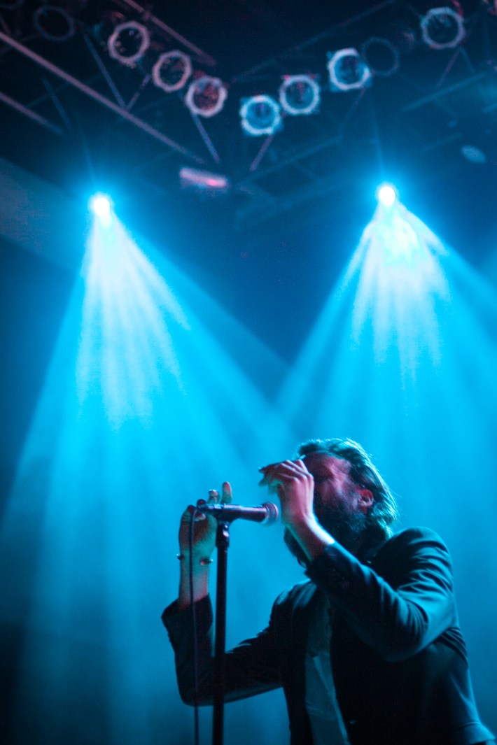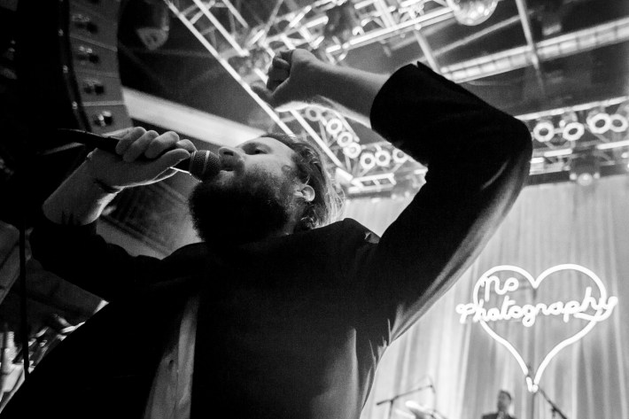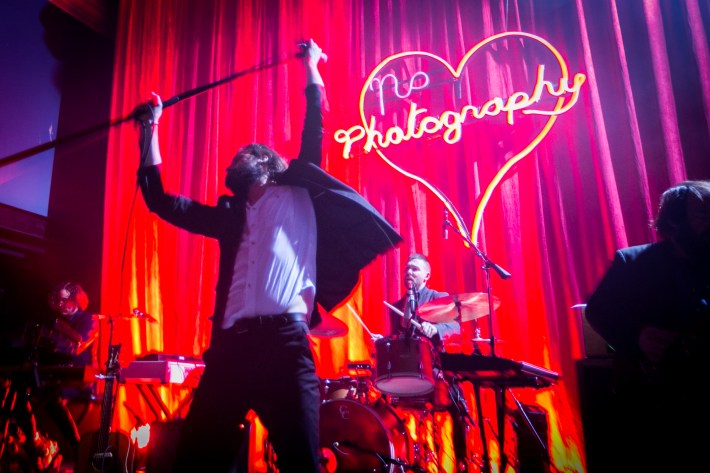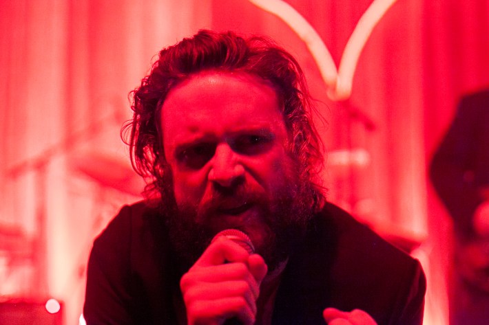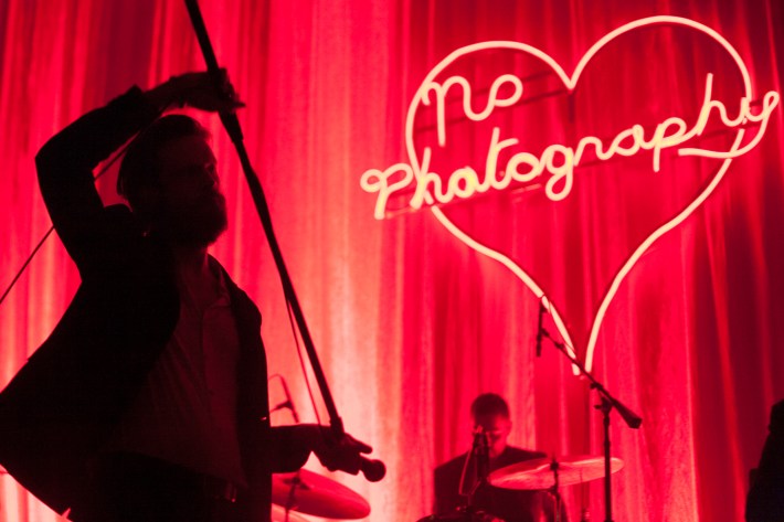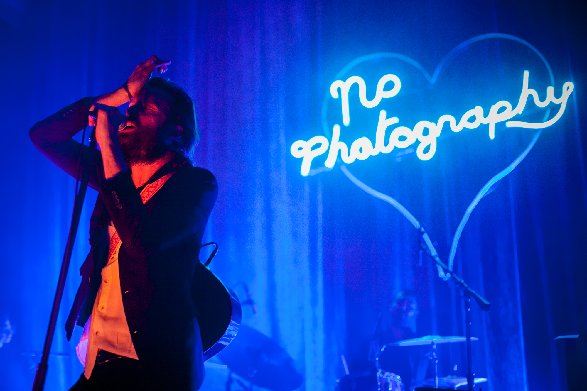 Father John Misty has been out on the road promoting his latest record, I Love You, Honeybear, for the past month and will continue to travel the country well into early summer. Photographer Tom Daly caught his set at Washington D.C.'s 9:30 Club, along with opener King Tuff, whose Black Moon Spell dropped last fall. Shrouded in an intense layer of fog, King Tuff's bassist gave a shout-out to D.C. for legalizing marijuana toward the end of their dynamic set. Father John Misty's big up to the District of Columbia was a tad more smarmy: "Thanks for coming out you razor sharp, jaded D.C. cynics." FJM said this after snagging a girl's cell-phone from the audience. She had been shooting a video, and FJM took the opportunity to record himself singing on stage in front of the neon "No Photography" sign. It was a pointed, sarcastic gesture, and the audience applauded loudly when the song was through. FJM assured the crowd that his encore was "meticulously curated for maximum pants moisture," and it included a cover of Leonard Cohen's "I'm Your Man." Scroll through Daly's photos of the performance above.