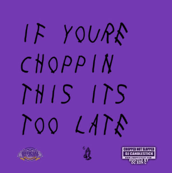 Drake loves Houston, and to hear Drake tell it, Houston loves Drake. Some evidence to support that second premise: Houston screw legend OG Ron C has issued his latest chopped and screwed Drake full-length. Because he chopped If You're Reading This It's Too Late, it's called If You're Choppin' This It's Too Late. Effective! He even chopped the brand new physical edition bonus track "My Side." It is not helping me break out of my mid-afternoon semi-slumber right now, but it's making that semi-slumber a lot more entertaining. Sink into aural quicksand below.