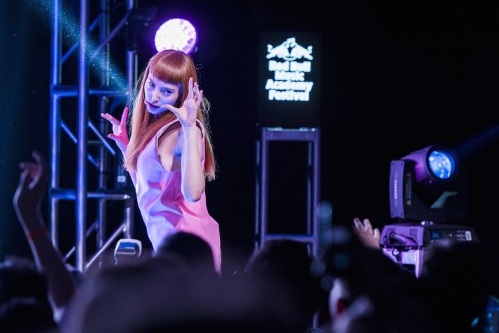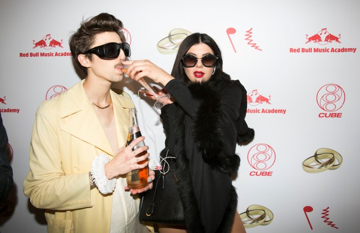 The discourse surrounding PC Music is filled with a lot of baseless opinions masquerading as people doing their best to be the first ones to finally "get it": It's a takedown/celebration of the vapidity of modern pop music! It's a hyperrealistic deconstruction of society's obsession with commercialization! It's all an allegory about the darkness inside us! There's a grain of truth in all of those lines of reasoning, but it's mostly bullshit. If last month's SXSW showcase and this weekend's POP CUBE exhibition -- which was part of the Red Bull Music Academy Festival -- are any indication, PC Music are here to have fun, and be funny doing it. There's no big agenda. Sure, most of them are art-school kids, and that comes with a certain level of theatricality, but most of the presentation just feels like a group of friends goofing off and making some killer music in the meantime. You can see that in the lead-up to the POP CUBE event: There's a teaser video, where a self-serious A. G. Cook goes in deep on his ~process~ in the studio, or the Guardian profile piece, where a reporter is led through their funhouse-mirror factory, which includes meeting GFOTY while she's laying in bed in a hotel next to a naked guy. These aren't the markings of some intellectual dissertation; it's people fucking with everyone just for the hell of it. Because, honestly, if I were being billed as the Next Big Thing, that's exactly what I would do, too: At least give them something to write about. Strip away all that artifice, and what are you left with? People trying to make you dance, and maybe put a smile on your face and feel good about yourself for a few pop-song-minutes at a time.