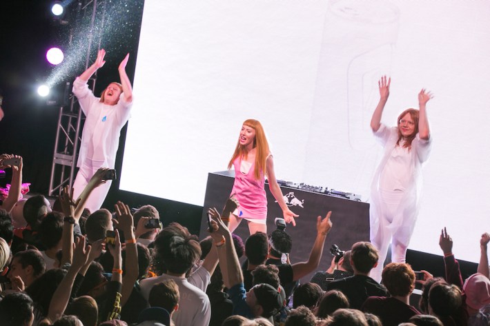 Which means, unfortunately, that people stood like statues for Hannah Diamond's set, and you could tell she was a little thrown off by it at first, looking to the audience for a reaction that she never really got. She was introduced by an already-dated MyIdol figurine, and then launched into some spastic cheerleader dancing, like Bring It On on poppers. She ran through her best songs like "Pink And Blue," "Keri Baby," "Every Night," and "Attachment," and for the latter she brought out some acrobats dressed in all-white to join her on stage. She debuted a new single called "HD" that sounds like a lot of fun, and she ended the night with her very own dancing shadow iPhone commercial. Even though the crowd was less receptive than they probably should have been, her lip-synced set was a highlight of the night through sheer force of personality.