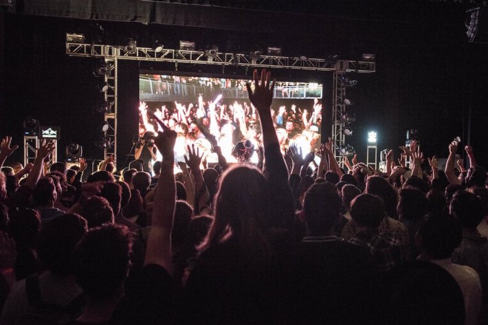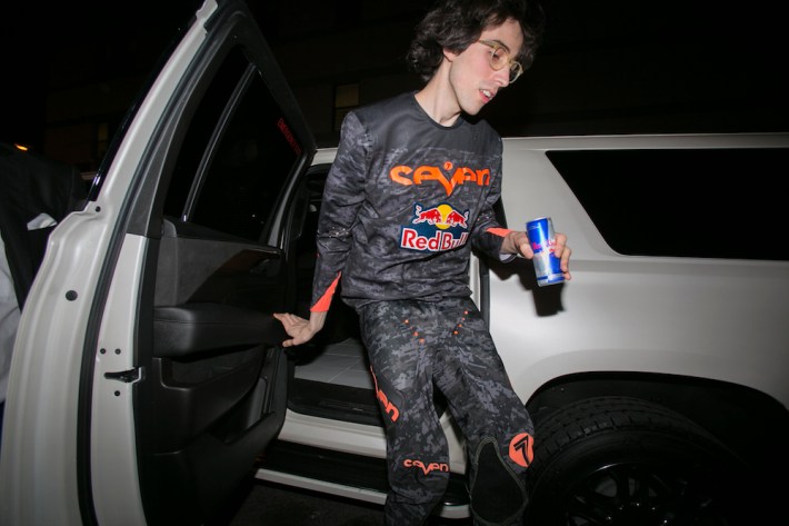 And it seems to be working, judging by the line that was wrapped around the BRIC House in Brooklyn when fellow Stereogum staffer Gabriela Tully Claymore and I arrived on Friday night. Just as we got there, a humorously large white limousine pulled up. Soon after, QT jumped out and took her place atop a Red Bull-branded DJ truck that was parked outside. Thus began the procession of the PC Music elite: A red carpet was rolled out and, one by one, the rest of the crew made their way out, flanked by a horde of "paparazzi" all wearing POP CUBE T-shirts. Random passersby might have thought it was a massive movie premiere filled with stars they didn't recognize. For the people waiting patiently in line, it was the equivalent of Oscarnight. Hannah Diamond flashed a smile and threw on her sunglasses; GFOTY stumbled out with a cocktail in one hand. And after a quick stop by an interviewing station that they had set up, they were whisked away inside. The rest of the crowd was let in shortly after, and everyone was given the opportunity to take a picture on the red carpet before going inside. We obliged, of course. Because PC Music are not about exclusivity -- they want everyone to feel like a star.
