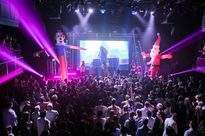 Then GFOTY came on, and blew that all to shit, demonstrating that you can show the darkest of human emotions through the digital void. She's the punk of the PC Music crew, and she gave the best set of the night by far. Signage introduced her as a Grammy Award winner and as having 100 hit singles, and from the second she came out, it was pretty easy to believe all that was true in some alternate universe. GFOTY's a lot more raw and less manufactured than the rest of the collective -- instead of covering up her imperfections in glossy high-definition, she broadcasts them to an exaggerated degree. On stage, she wore a miniskirt that she proceeded to stuff with dollar bills -- by the end of her set, she'd be in a nude bra and bikini, screaming into the mic on stage as if she were taking her last dying breath. On either side of the stage, a wacky inflatable lawn ornament towered over the audience -- one was a clown, the other a Santa -- and she threw an inflatable palm tree into the audience, repulsed by its meager existence. GFOTY may have been the most massive personality, but she was also the most real -- like Ursula from The Little Mermaid if she took up a dance-punk side project. "Drown her in my tears," goes the breakdown to one of her songs -- it's GFOTY in a nutshell: over-the-top reactions grounded in an overwhelming sadness. For as much as I love the rest of PC Music, GFOTY is making the only music that feels like it needs to get out, lest it build up and destroy from the inside out.