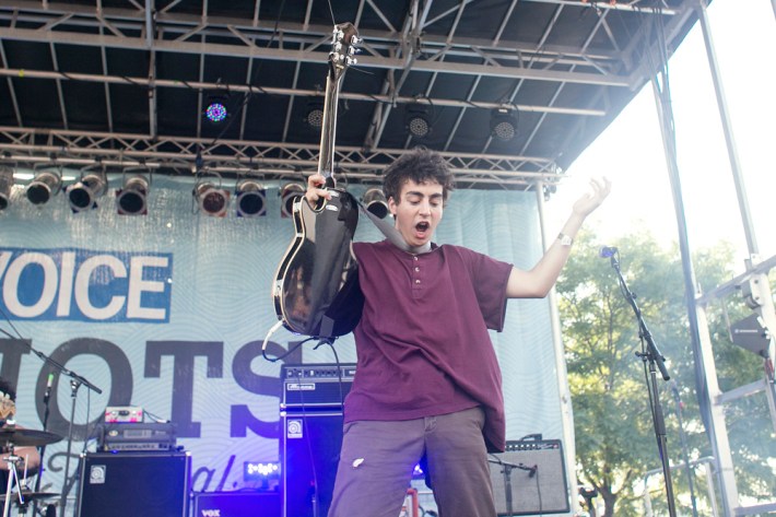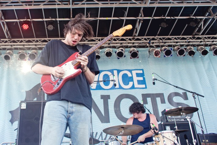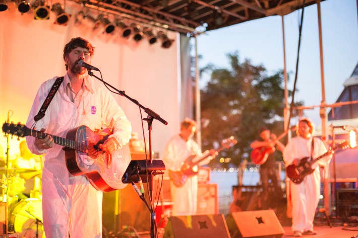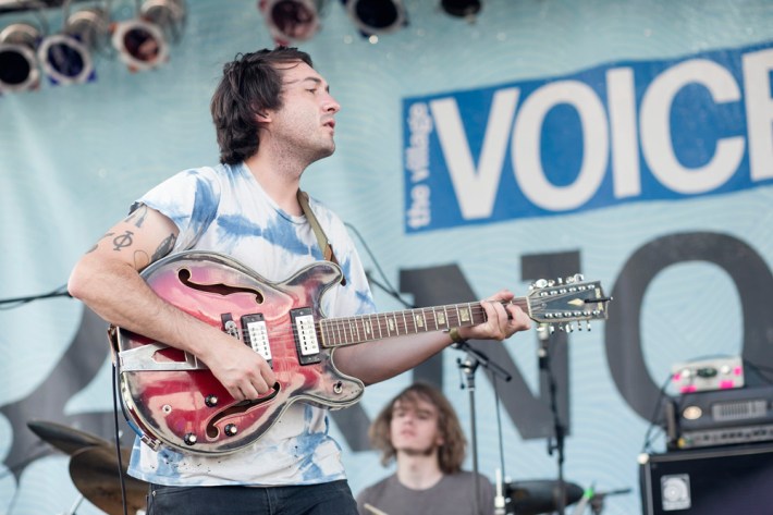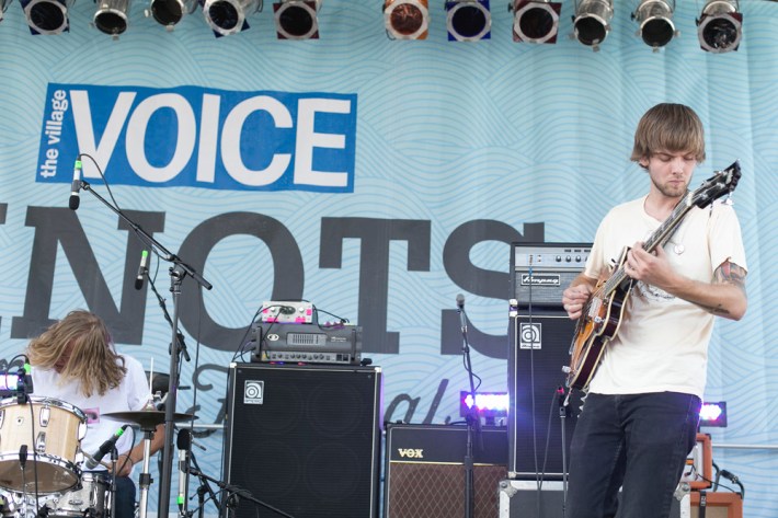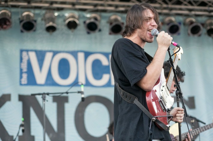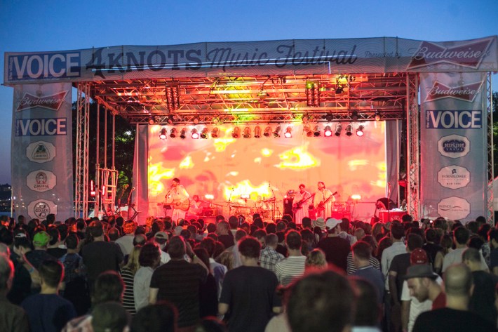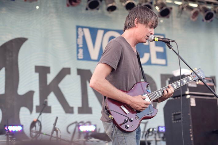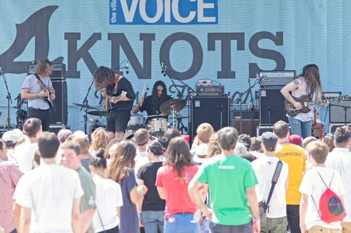 The Village Voice's annual midsummer 4Knots festival faced two logistical changes this year: a location switch-up and a transition from free to the modest general-admission fee of $25. This is the fifth year the festival has taken place, and in many ways, it'd outgrown both the free price tag and the Financial District South Street Seaport location that housed previous iterations. Neither of these new factors stopped New Yorkers from coming out to Saturday's lineup, which boasted plenty of grunge, surf, and psych rock acts like UK lush indie-rockers and Band To Watch Happyness, California garage rocker Mikal Cronin, and New Jersey punk trio Screaming Females. For most who attended, it seemed a little odd that Stephen Malkmus And The Jicks played the second-to-last set instead of headlining the event, but perhaps Super Furry Animals were accorded that honor since they hadn't played New York in six years. But by the time they took the stage in all-white jumpsuits, backed by an ever-evolving palette of psychedelic colors, plenty of other acts had broken in the small but eager crowd.