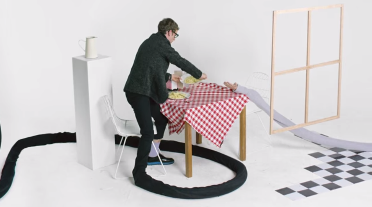Miami Horror's new video for "Cellophane (So Cruel)" makes your dream of being in two places at once a reality. A camera pans around a room with white floors and white walls, showing people doing simple tasks alongside an extended hand or foot. The camera then follows the extended hand or foot to the next person, and repeat. Basically, every person in the video has a hand or a foot in some other scene. It sounds complicated, and it is. See the still above for reference. Perhaps the inspiration for the video, directed by Lachlan Dickie, came from this line in the song: "You say you gotta take off / Have you got somewhere better to be?" The poppy Australian synth quartet are no strangers to obscure videos, as we learned back in April with their crime drama video for "Love Like Mine." Both songs are found on the band's sophomore release, All Possible Futures. Watch below.