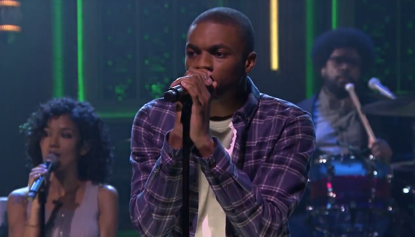 The airy R&B singer Jhené Aiko is really the only famous guest on Vince Staples' excellent new album Summertime '06. And "Lemme Know," the track that features her appearance, isn't the sort of thing that becomes a hit. It's a sleepy, murmuring meditation on sex and relationships that has Staples and Aiko reciting their lines in tandem. But when Staples made his debut on The Tonight Show, that's the song he chose to perform. Staples stood center-stage, leaning on a mic stand, while Aiko and the Roots backed him up. This wasn't an energetic performance, but Staples has a certain tight-wound magnetism, and it was cool to see that come across on a TV screen. Staples also made the tucked-in T-shirt look work for him. Watch the performance below.