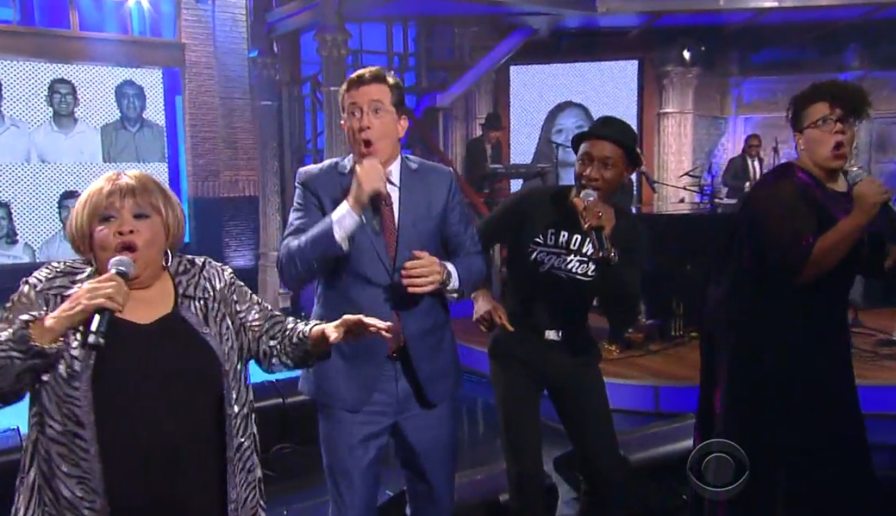As you could probably tell from the deafening thunder of hype, Stephen Colbert took over for David Letterman as the host of the Late Show last night. And while his first episode didn't have an advertised musical guest, Colbert ended up with a whole pile of them. His first episode of the show ended when Jon Batiste, his bandleader, led an all-star cabal of musicians through a cover of Sly And The Family Stone's classic "Everyday People." The group featured Mavis Staples, Buddy Guy, Alabama Shakes' Brittany Howard, Ben Folds, Aloe Blacc, Derek Trucks, Susan Tedeschi, Paul Janeway, and Beirut members Zach Condon, Kyle Resnick, and Ben Lanz. That's a lot of people! Colbert himself also joined in to sing a couple of lines. Watch the performance below, via Vulture.
