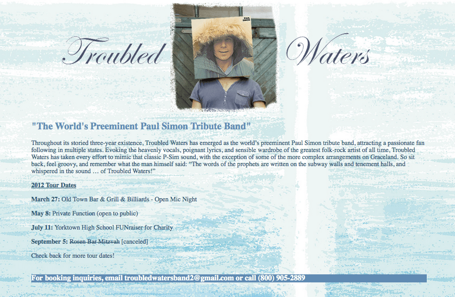 Last month, it was announced that the first band to perform on The Late Show With Stephen Colbert would be a Paul Simon tribute act called Troubled Waters. ("Band" as in "not a solo artist"; following the premiere night's surprise guests that joined bandleader Jon Batiste, Colbert's first musical acts were Kendrick Lamar and Toby Keith.) Of course, there is no such thing as Troubled Waters. When we first reported that story, the "band" didn't have a website. Now they do -- troubledwatersband.band went live on 8/25, a day after that news was first revealed. It's absurdly and obviously fake, listing jokey tour dates (the Rosen bar mitzvah was cancelled?) from 2012. (Note the .band domain didn't become available until this year.) The site provides a contact number for Troubled Waters, but when you call that number, you get an outgoing voicemail (answering machine?) message, saying, "If you're calling about the lawnmower advertisement on Craigslist, it has already been sold. But if you're interested in having Troubled Waters play at your wedding, corporate event, or bachelorette party, please leave a message and we will return your call as soon as possible." (The mailbox is full, sadly.) There's also a funny email address -- troubledwatersband2@gmail.com (as if troubledwatersband1@gmail.com was already taken) -- to which we wrote last week, but did not hear back. So let's figure this out: Who the hell are Troubled Waters?