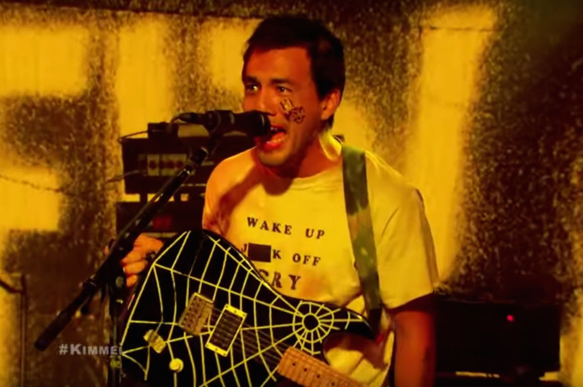 Los Angeles punk rockers FIDLAR, fresh off releasing their sophomore album Too, were the musical guests on last night's episode of Jimmy Kimmel Live, and I honestly don't know why more late-night talk shows don't book high-energy pop-punk bands like that. They're always fun! On last night's show, FIDLAR knocked out a fast, nervy take on "West Coast," one of the singles from the new album. Frontman Zac Carper hit the stage with "hi mom" written on his cheek and a piece of black electrical tape on his T-shirt. Apparently, some producer decided that you can't go on TV in a "wake up, jerk off, cry" shirt. Watch the performance below.