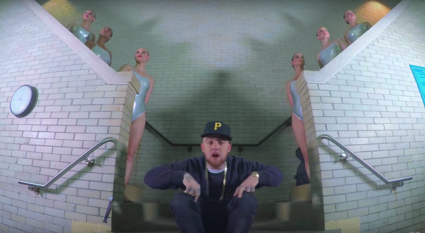 The Pittsburgh rapper Mac Miller released his impressive GO:OD AM album last week, and we've already posted his videos for "100 Grandkids" and "Brand Name." Today, he gives us a third video, a fun and inventive clip for the loping album track "Clubhouse." This one is some sort of collaboration between Pitchfork and GoPro, and the director, my old Pitchfork co-worker Eavvon O'Neal (real good guy) shot the entire thing on a GoPro. The clip finds Miller at an indoor swimming pool, spending quality time with a team of synchronized swimmers. He wears two gold chains while actually swimming, which can't be good for the chains, right? Watch the video below.