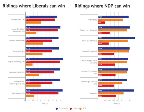 An important part of voting this time is voting strategically, since the Liberals and NDP are splitting the vote.unfortunately, conservative government can win without a majority because the other parties split the vote.If you live in one of the ridings below, you can follow this chart to vote strategically in order to kick out conservative gov!i hope this is helpful and not too confusing, and i apologize again to non- Canadians who I am accidentally bombarding with election info.much love!xxxxx