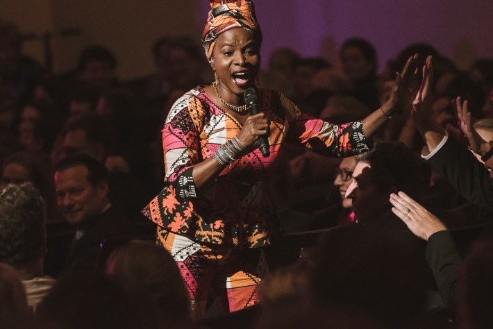 The Foundation's namesake did not attend the two-hour concert, but in a video message recorded on a dusty road in Washington (where he is filming Showtime's 2017 Twin Peaks reboot) the director said, "Every human being has a treasury within, and Transcendental Meditation gets you there easily and effortlessly. And it changes life for the good." Language like that might help you understand why TM is often accused of being a cult or at least a religion. Early in the night Angélique Kidjo explicitly addressed such criticism by promising it was neither.
