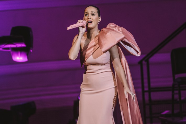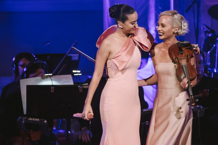 Perry explained in a clip that screened before her headline set that she started "TMing" about five years ago with DLF Executive Director Bob Roth. She joked that she doesn't always meditate the recommended two times a day because she's so prolific on social media (it was her second social media use joke of the night) and may need a refresher course. But the pop star did explain how it changed her life and made her feel "like the neuron pathways in my brain [were opening] up." Clutching a pink microphone that matched her gown, she sang five of her massive hits that had been reworked by the house orchestra. "Roar" first, then "Teenage Dream" and "Wide Awake." "Dark Horse" featured a killer violin solo from Margot (of the Dolls) in lieu of Juicy J. "Firework" saw four ballerinas come out onstage and dance around her.