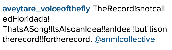 Avey Tare clarified in a comment on his Instagram post: "TheRecordisnotcalledFloridada! ThatsASong!ItsAlsoanIdea!!anIdeal!butitisontherecord!!fortherecord."