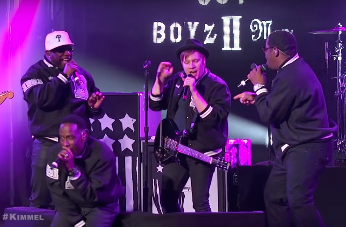 All month, Jimmy Kimmel Live has been bringing together pun-based band combinations for its Mash Up Monday series: Color Me Bradd, Joss Stone Temple Pilots, Jewel & The Gang. The show saved its biggest combination for last. On the outdoor festival stage last night, Kimmel united R&B legends Boyz II Men with emo superstars Fall Out Boy for a new version of Boyz II Men's world-conquering 1991 debut single "Motownphilly." In case, you're wondering, no, "Motownphilly" does not sound good at all with FOB's compressed crunch underneath them. But the performance has a fun energy to it, and Patrick Stump is the rare radio-rock frontman who can sing harmonies with Boyz II Men without embarrassing himself. Watch the performance below.
