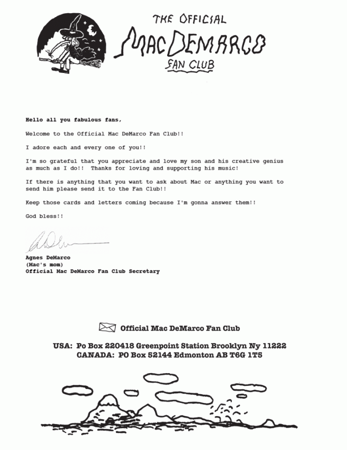 The not-free membership (also known as a Mac "Disciple") can be purchased for an annual fee of $50 for U.S. residents and $75 for Canadian residents. A membership costs $85 worldwide. Disciples will receive all of the same benefits that regular ol' fans are guaranteed, but will also be sent a limited edition Official Mac DeMarco Fan Club ring, a birthday message from Agnes DeMarco, a holiday surprise from DeMarco, early bird ticket access for select concerts, and an annual newsletter/zine. A Fan membership will get you digital newsletters, online fan club access, videos/promos/mp3s in your email inbox, Mac DeMarco gifs/wallpaper, meet and greet opportunities, and eligibility to enter exclusive contests. Read Agnes DeMarco's letter to fans: