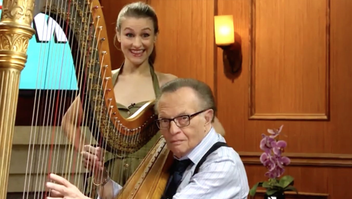 Joanna Newsom does so little mainstream media that it's absolutely fucking bizarre to see her sitting down with American fossil Larry King, a man who has seemed permanently bemused for decades. We've already seen a clip of her teaching King to play harp, which was weird enough. And now the are a few more clips from Newsom's interview on the online talk show Larry King Now up online. From what we've seen, the best parts are the ones where King asks Newsom about Andy Samberg, her husband. Sample question: "Does he like the harp?" Another sample: "Does he understand your vocals and your songs?" Also, Newsom names Dolly Parton and Kendrick Lamar as artists she'd love to work with.