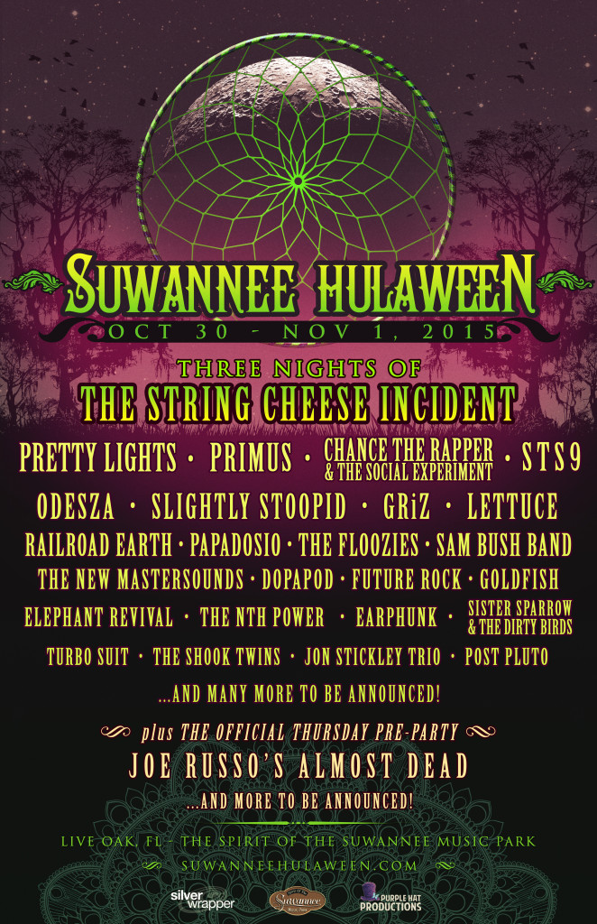 Jam band festivals are a breed all their own. This year's edition of Suwanee Hulaween (held in the Spirit Of The Suwanee Music Park in Live Oak, Florida) featured seven(!) String Cheese Incident sets, one of which was a special Halloween set in conjunction with the festival's costume theme this year: "Ghoul Train," which they defined as "late '70s early '80s TV hit Soul Train x Monsters or The Addams Family." Besides the music, Suwanee Hulaween also apparently offered six bath houses(!?), disc golf, and something called the "Observation Beehive." More fun facts: New rules this year included "No totems past the soundboard" and "no fire spinning unless authorized by fire marshall." You can drive a golf cart into the festival as long as you have proof of insurance and pay trail fees. Somehow, they got GZA involved in all this, playing the role of Don Cornelius for the String Cheese Incident's "Ghoul Train" set. Also somehow, Chance The Rapper & The Social Experiment wound up on this bill amidst other highly relevant 2015 acts like Slightly Stoopid. These jam band fests are probably way better at creating the alternate reality all festivals like to claim they do, but what use is that if the alternate reality is worse than your actual one.