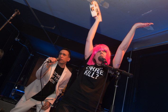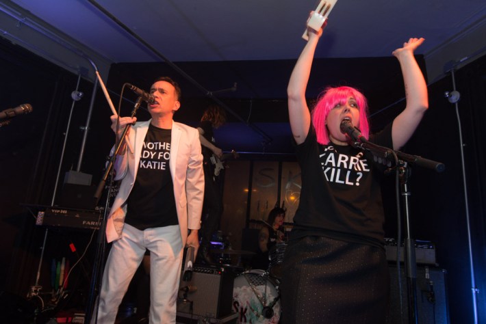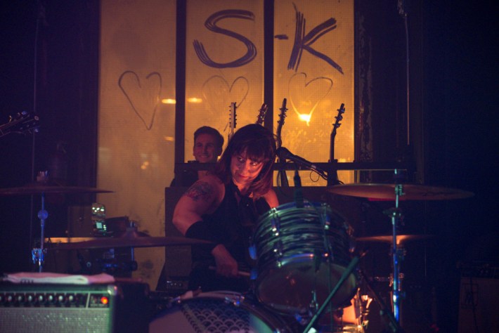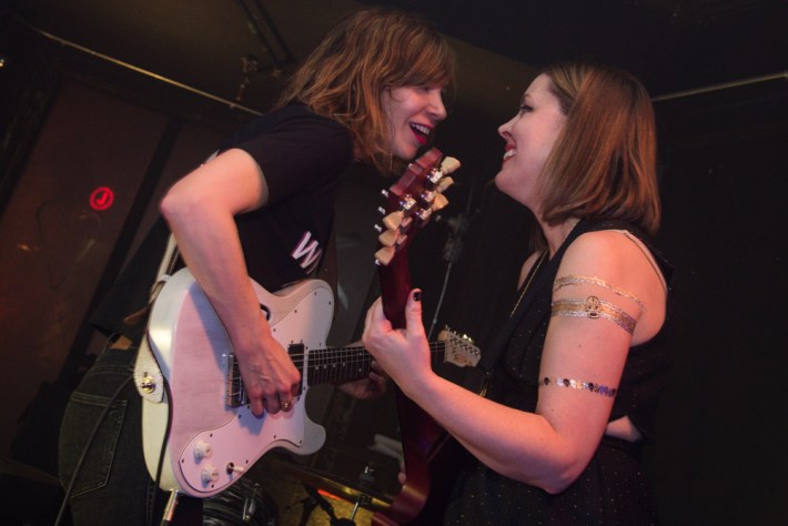 Brownstein noted the irony of the night's intimate setup: while it was awesome to play a 300 cap room, the stage was so small they couldn't move around. Still, it was a thrill just to hear "Dig Me Out" again. For an encore Portlandia/Late Night/Blue Jean Committee's Fred Armisen again joined in for "Rock Lobster," the B-52s cover Sleater-Kinney brought back to their repertoire earlier this week. In this bow, Armisen's shirt read "ANOTHER LADY FOR KATIE" and Tucker's "FUCK CARRIE KILL." None of this cheeky swag was for sale at the merch booth, but they did offer sweaty concertgoers Sleater-Kinney scarves that would've been seasonally appropriate in any other year. Check out photos from the show above and a video of "Price Tag" below.