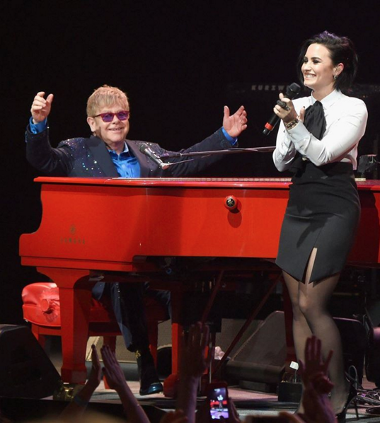 Elton John performed an intimate show at the Wiltern in LA last night, and he brought a few special guests to the stage. Demi Lovato joined John for a rendition of "Don't Go Breaking My Heart," Shawn Mendes sang along on "Tiny Dancer," and Patrick Stump performed "Saturday Night's Alright For Fighting." John also dedicated "Rocket Man" to David Bowie, and played an instrumental "Space Oddity" leading into it. Check out videos of the performances and the setlist below.