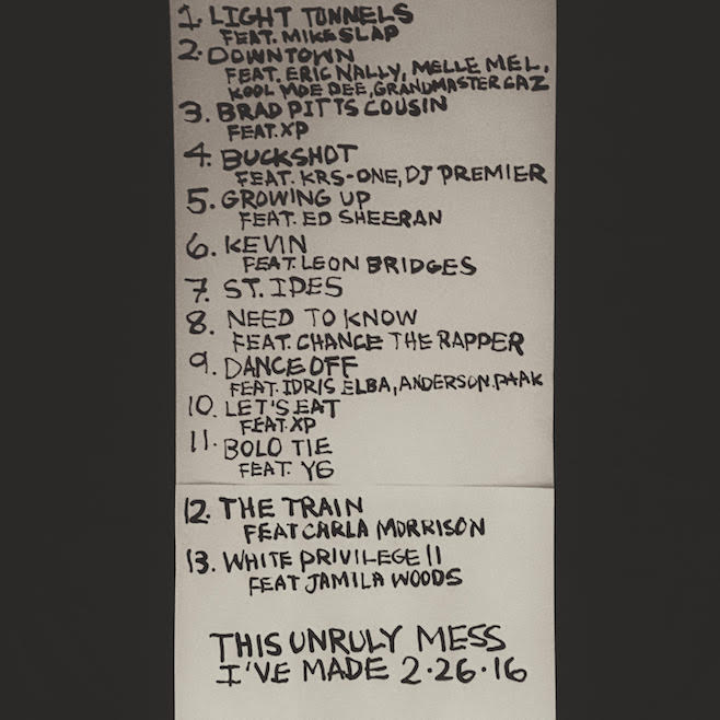 Macklemore & Ryan Lewis have released the tracklist for their imminent new album This Unruly Mess I've Made, and the guest list is extremely impressive. Which is weird for an album that includes the worst song ever recorded. (Correction: Yesterday's godawful Valentine's Day curio "Spoons" does not appear to be on the tracklist.) Thanks to the string of pre-release singles, we already knew a large number of the quality entertainers would be participating including Leon Bridges, Jamila Woods, and the foundational hip-hop triad Melle Mel, Kool Moe Dee, and Grandmaster Caz. (And on the disreputable front, we were aware Ed Sheeran and Foxy Shazam's Eric Nally would be involved.) Now Pitchfork points out that the album also features Chance the Rapper, Anderson .Paak, YG, KRS-One, DJ Premier, Idris Elba, Carla Morrison, XP, and Mike Slap. Check out the hand-scrawled tracklist below; very Kanye-esque!