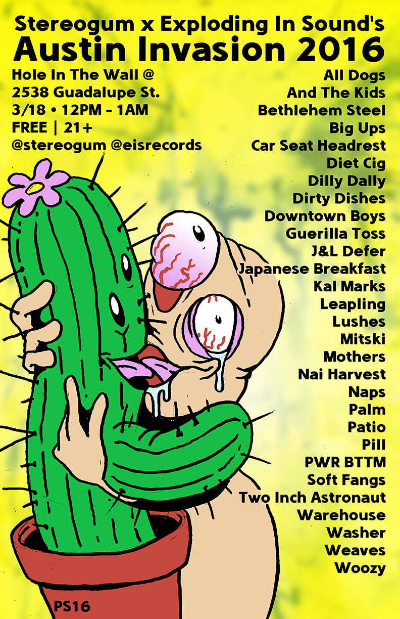 Later this month Stereogum will return to Austin, TX to present a free all-day-and-night rock showcase at The Hole In The Wall. For the second year, we're partnering with Brooklyn label Exploding In Sound to produce the event, which takes place during SXSW, but is unofficial and unsponsored. Last year's was so much fun, we've again crammed the lineup with over two dozen bands you've probably read about here on the site. It all goes down Friday 3/18 at 2538 Guadalupe St. beginning at noon and ending around 13 hours later. Check out the poster designed by Preston Spurlock up top (or hi-res here) and let us know on Facebook if you're coming! Below you will find the set times.