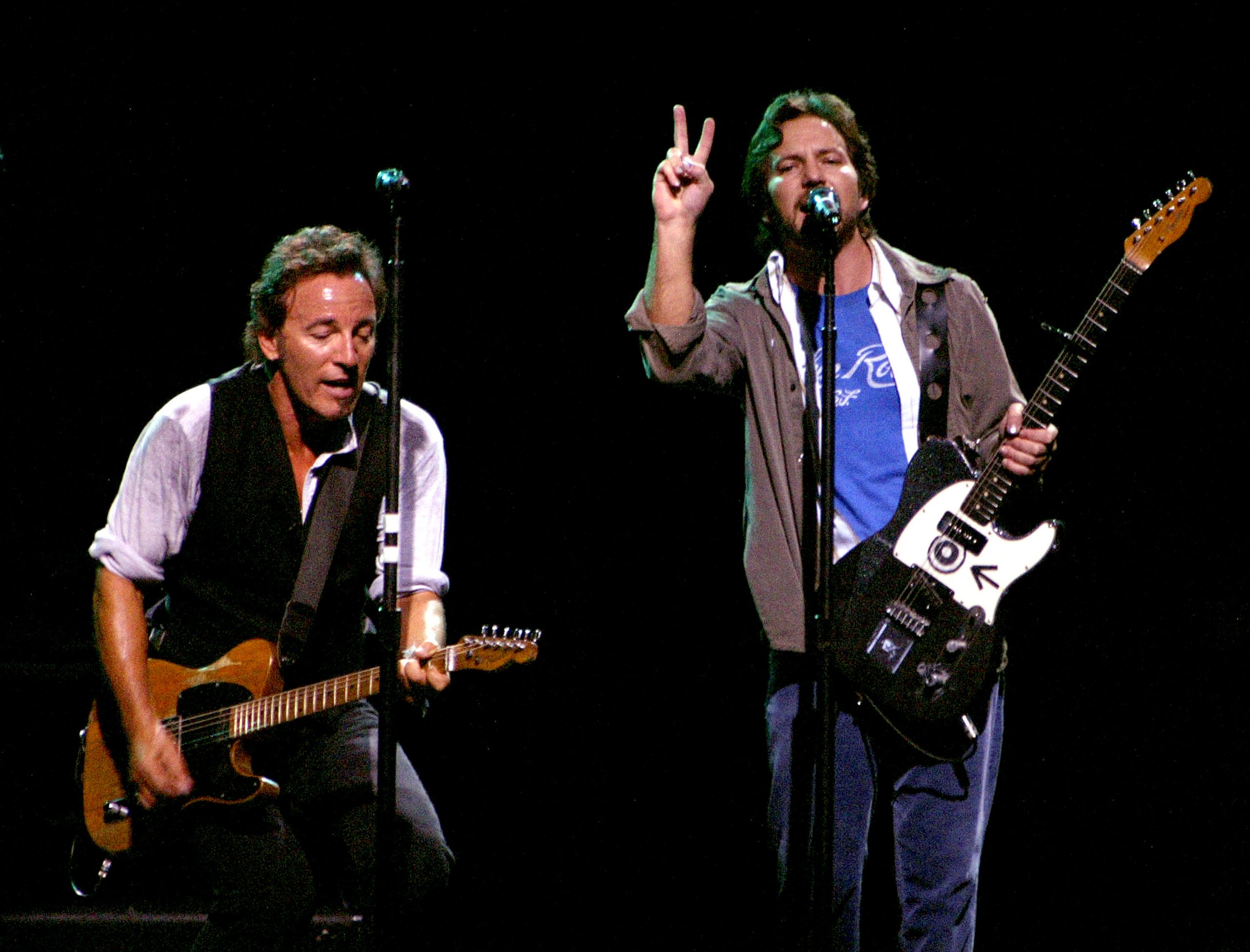 Last night, Bruce Springsteen's much-acclaimed River tour took him to the Key Arena in Seattle, the adapted hometown of Eddie Vedder. And during last night's show, Springsteen and Vedder held a sincere-rock-star summit up on that stage, with Vedder joining Springsteen to sing the Born In The USA album track "Bobby Jean." It wasn't the first time they've shared a stage -- that photo above is about 12 years old -- and it likely won't be the last. Look how happy those guys are together! Watch a fan-made video below.