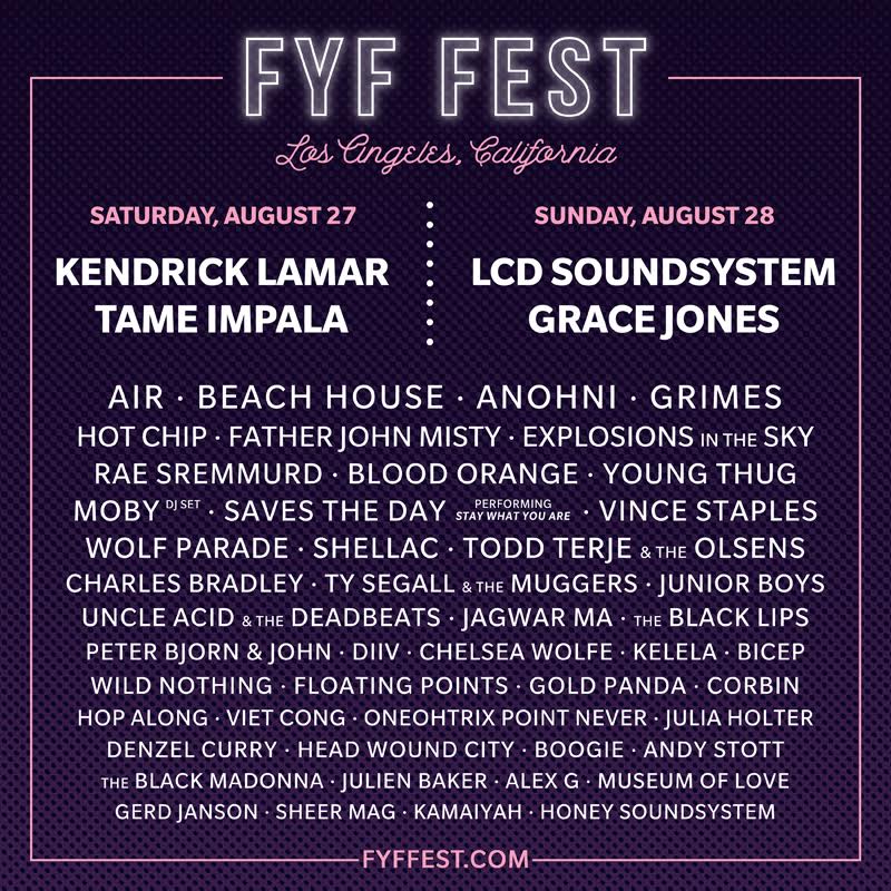 FYF Fest is returning to LA in August, and this year's lineup has just been officially announced. Kendrick Lamar, Tame Impala, LCD Soundsystem, and Grace Jones are headlining, and the rest of the bill is just as good: Wolf Parade, Beach House, Father John Misty, Vince Staples, Young Thug, Air (performing in the US for the first time in 5 years), Ty Segall, Hop Along, Julien Baker, Viet Cong, Oneohtrix Point Never, Explosions In The Sky, Rae Sremmurd, Todd Terje...I could go on, but I'd end up listing more or less the entire lineup, so I'm just gonna stop there. The whole thing goes down 8/27 and 8/28 at LA's Exposition Park, and tickets go on sale here starting this Friday, 4/1, at noon PT. Check out the full lineup below.