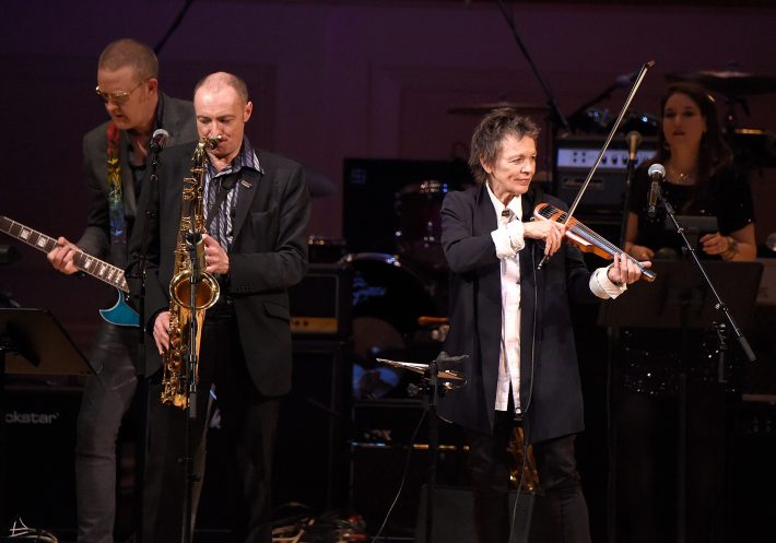 HoLY HoLY, the superish-group featuring the Spiders From Mars drummer Woody Woodmansey and producer Tony Visconti, was the Hall's house band and you couldn't ask for a better one. It's too bad they somehow pissed off Questlove (whose Roots crew and guest singers dropped out of performing "Aladdin Sane" and "Fame" at the last minute) since the show could've been more diverse. Hard to criticize the booking of these luminaries from Bowie's adopted hometown of NYC, though: Cyndi Lauper kicking things off in a hot pink wig with a vibrant "Suffragette City," Cat Power (who once sang "Space Oddity" for a car commercial) delivering a smoldering "Five Days," Laurie Anderson and the unannounced Gogol Bordello playing back-to-back Low cuts, Rickie Lee Jones seemingly improvising the chords to an "All The Young Dudes" singalong, Sean Lennon strumming opposite J Mascis on the Dinosaur Jr.-interpolated "Quicksand" (and some "Andy Warhol") and Debbie Harry of Idiot Tour opener Blondie earning the night's first standing ovation with "Starman." (Patti Smith was sadly also a no-show due to voice problems.) In between, Joseph Arthur struggled with his looping pedal on "The Man Who Sold The World" and John Darnielle — seated at the piano for the Mountain Goats and Robyn Hitchcock's "Word On A Wing" — was obscured to the parquet behind an unfortunately placed music stand. (Arthur got a laugh after his performance by unfolding an American flag with FUCK TRUMP scrawled on it.)
