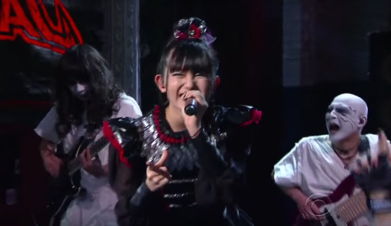Babymetal are a fascinating beast, a Japanese pop-idol trio who fuse bright, chirpy J-pop with pounding, triumphant old-school power metal. At home in Japan, they play arenas and make big-budget music videos. In North America and Europe, they're more of a viral-sensation type of deal, but that's still something. Last night, they appeared on American TV for the first time ever, performing their single "Gimme Chocolate!!" on the Late Show With Stephen Colbert. They brought along their cute-centric choreography and their corpsepainted backing band, and it was quite a spectacle. Watch it below.