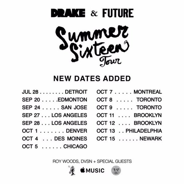 Drake and Future have toured together a few times, and last year, they teamed up for the collaborative album What A Time To Be Alive. And this year, they'll spend a bunch more time together. Drake -- whose new album Views From The 6 comes out on Friday -- has just announced a big summer tour with Future. And the Toronto stops on that Summer Sixteen tour will double as this year's version of the OVO Festival, the big show that Drake brings to his hometown every year. This year, the festival runs two nights. Wiz Khalifa and Snoop Dogg will do a show together 7/29. And on the nights of 7/31 and 8/1, Drake and Future will take over. Those are the only announced artists, but as always, we can probably expect a ton of special guests. Below, check out the dates for Drake and Future's tour.
