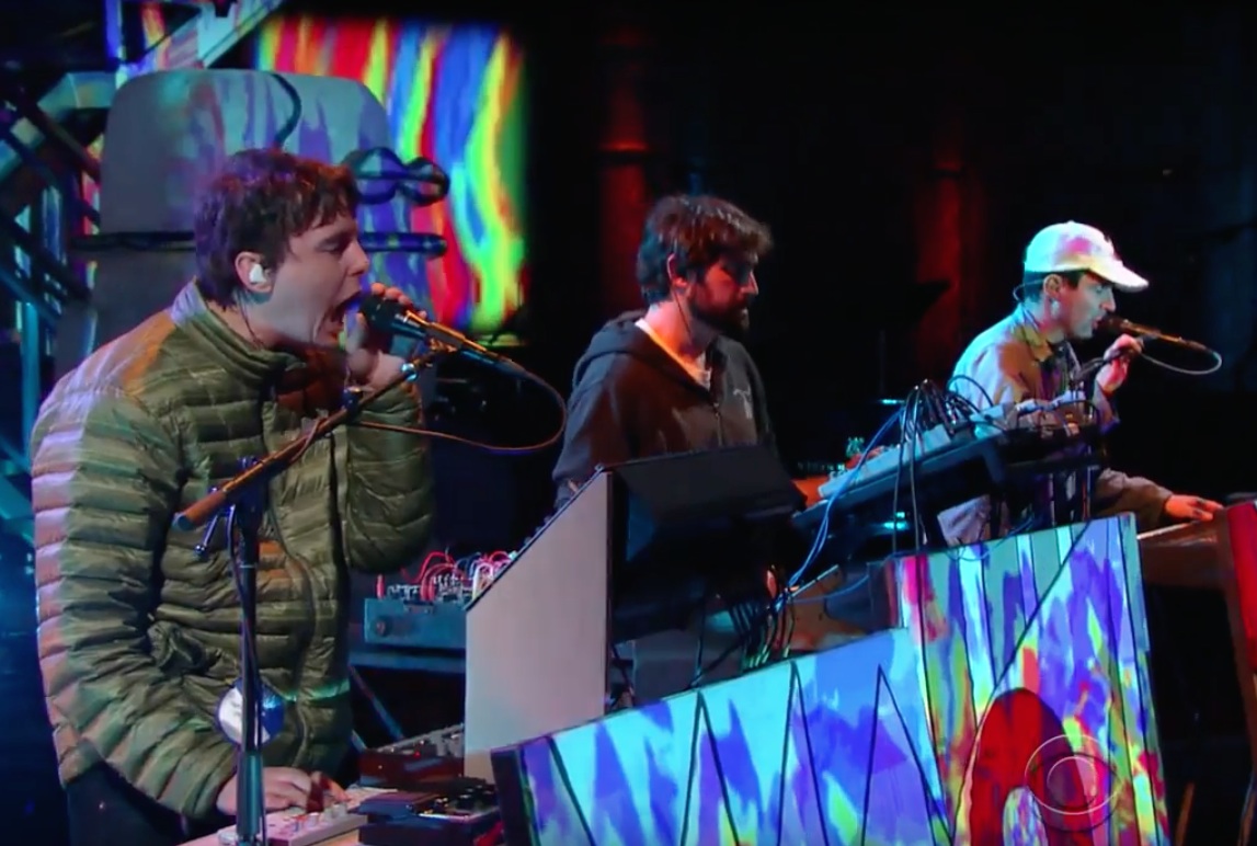 It already feels a million years old, thanks to a months-long onslaught of huge album releases, but Animal Collective's grand return Painting With is a 2016 album, and they're still out promoting it. Last night, AnCo served as musical guests on the Late Show With Stephen Colbert, where they performed the album's antic first single "FloriDada." All three regular members perched behind banks of electronics, with a drummer behind them, harmonizing furiously while trippy light patterns swirled all around them. The huge fake Easter Island heads that are part of their current live show also made it onstage. Watch the performance below.