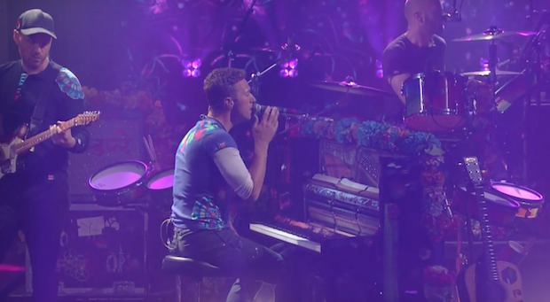 Coldplay were the musical guests on last night's episode of The Late Show With Stephen Colbert. They performed two A Head Full Of Dreams tracks: "Hymn For The Weekend" on the televised version (sans Beyoncé, obviously), and a near-8-minute version of "Up & Up" as a web exclusive. Chris Martin also sat down for a bit with Colbert to write some "lyrics" to the late-night show's theme song. Watch everything below.