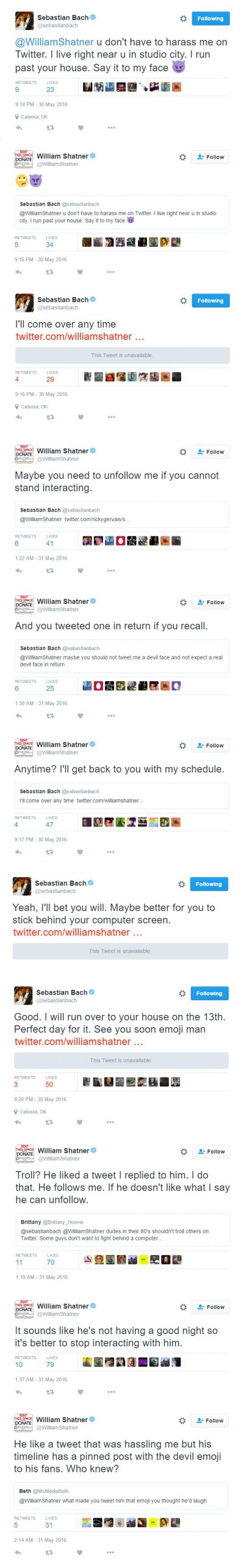 Look, sometimes celebrities get upset at each other. And sometimes, those celebrities seem like people who should not necessarily exist in the same universe. Also, sometimes their disputes make no sense whatsoever! All of that seems to be the case here. As Blabbermouth points out, William Shatner, the 85-year-old Star Trek star and Priceline pitchman, is not getting along with Sebastian Bach, the former singer for hair-metal greats Skid Row. Bach has unleashed a string of angry tweets at Shatner, some of which have been deleted and one of which included what appeared to be the actor's home address. As far as anyone can figure out, Bach got upset when Shatner replied to one of his tweets with the purple devil emoji. And now Bach wants to beat up Shatner. Look, I don't fucking know. See if you can sort out the mess of screengrabs below.