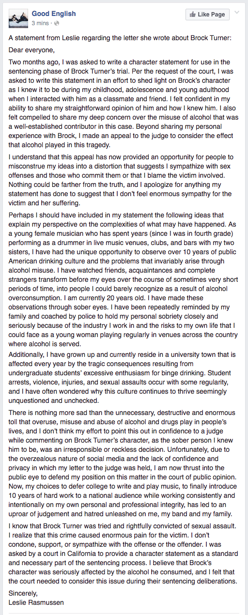 Turner was convicted of three counts of sexual assault in California for raping an unconscious woman behind a dumpster on Stanford's campus in 2015. He received a light sentence of six months in county jail with probation after Judge Aaron Persky said he worried a longer sentence would have a "severe impact" on the Olympic-caliber swimmer. The day after the ruling, Turner's now 23-year-old victim shared her lengthy, harrowing court statement via Buzzfeed, and since then, some unsavory messages of support for the defendant have come to light, including an especially repugnant Facebook status published by Turner's father. Another is a letter written to Judge Persky by Turner's childhood friend Leslie Rasmussen (pictured above on the right), who just so happens to drum alongside her sisters in Good English. The Cut published her letter in full yesterday after it was originally exposed on Twitter. Here is an excerpt: