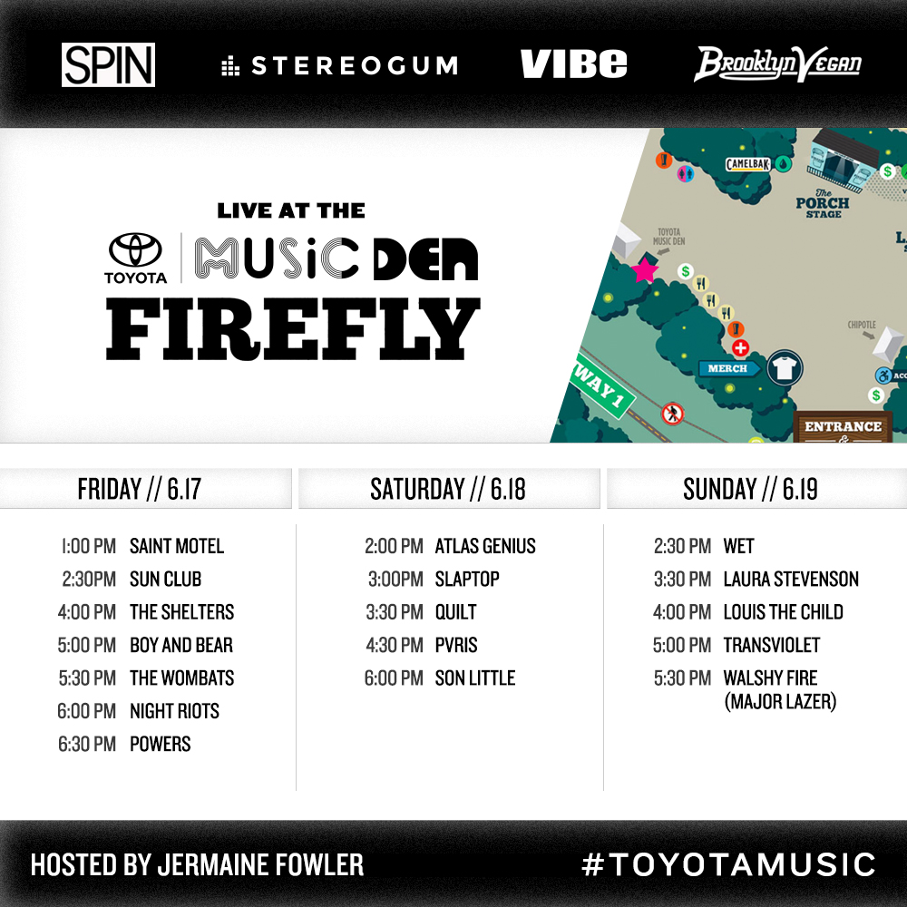 Summer festival season is in full swing, and this weekend's big event is Dover, Delaware's annual Firefly Music Festival. Once again Stereogum will be on site at the Toyota Music Den alongside Spin, Vibe, and Brooklyn Vegan. Friday, Saturday, and Sunday afternoon we'll host an array of intimate performances from artists including Quilt, Wet, Laura Stevenson, Sun Club, Son Little, and Walshy Fire of Major Lazer. Check out the full lineup below, and look for the Den across from the Porch Stage.