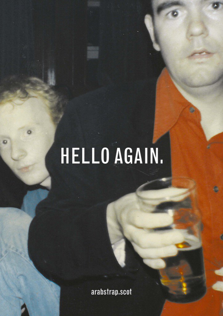 From 1995-2006, Glasgow duo Aidan Moffat and Malcolm Middleton perfected a dour strain of electro-acoustic indie rock under the name Arab Strap. Inspired by the urban folk and Midwestern post-rock of the Drag City label, their records for Chemikal Underground felt like the clever, disaffected ramblings of a smart-aleck drunkard just before he passed out on the bar. Other than a one-off reunion show in 2011, Arab Strap haven't been active for 10 years, but it looks like they're launching a full reunion this week. Moffat and Middleton shared the above artwork on Twitter, and the band's official site announces that they'll join BBC Radio 6's Steve Lamacq in studio this Wednesday at 4PM BST. Shy retirers no more, it seems!