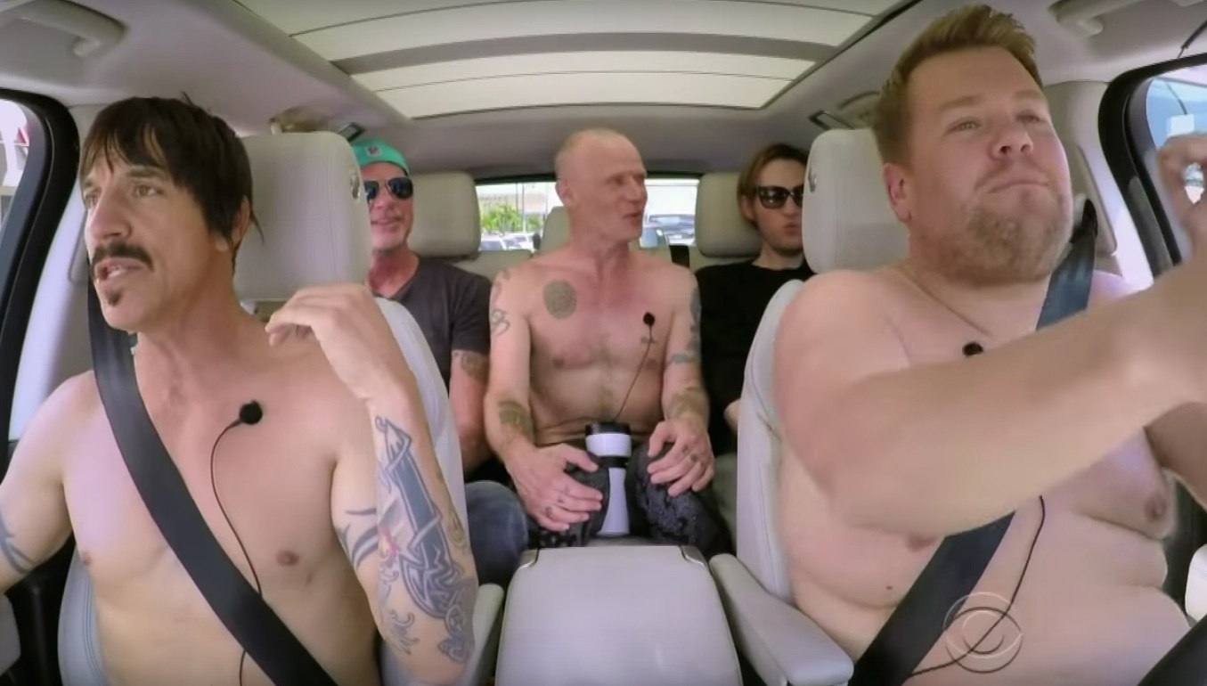 The legendary funk-metal goofs Red Hot Chili Peppers are a few days away from releasing their new album The Getaway, so naturally, they were the latests guests on James Corden's ridiculously popular recurring bit Carpool Karaoke. And you will doubtless be pleased to learn that Flea does that exaggerated head-bob thing even when he's sitting in the back of an SUV. He also does air-slap bass! There's a part of the bit where Corden and Anthony Kiedis get into a wrestling match on the front lawn of a stranger's house, and Kiedis absolutely obliterates Corden, possibly because Corden cannot stop doing his over-the-top laugh. And a bunch of them take their shirts off. Really, all of it is about what you'd expect. Watch the whole thing below.