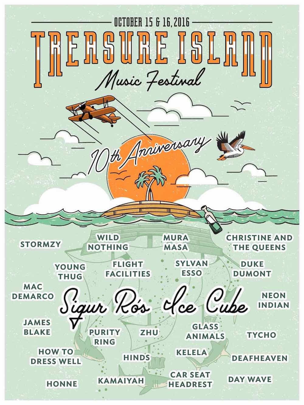 Treasure Island Festival has been held on its namesake in San Francisco Bay since its inception in 2007, but this year -- the festival's 10th annual iteration -- is the last time it will be held on the island. Starting next year, it will be relocated to elsewhere in the Bay Area, but for right now the fest is soldiering on as planned for one final Island bash. This year's festival, which takes place on 10/15 and 10/16, will feature Sigur Rós and Ice Cube as headliners, plus sets by James Blake, Purity Ring, Mac DeMarco, Young Thug, Car Seat Headrest, How To Dress Well, Sylvan Esso, Christine And The Queens, Stormzy, Neon Indian, Wild Nothing, Kelela, Kamaiyah, and more.