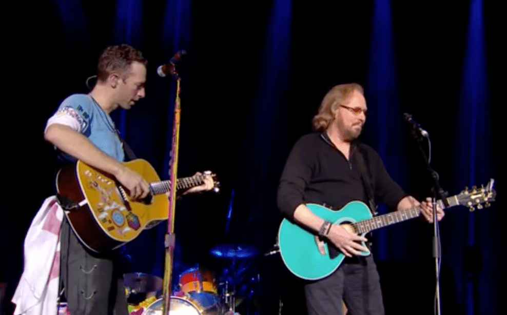Coldplay headlined the UK's Glastonbury Festival tonight, closing out the fest with a few special guests and some covers. Instead of paying tribute to the late David Bowie by playing "Heroes," Chris Martin announced that they would be honoring Viola Beach, the up-and-coming British band who were killed in a tragic car accident earlier this year, by covering their debut single "Boys That Sing." "We decided as a band, instead of playing 'Heroes' tonight, we're going to create Viola Beach's alternate future for them and let them headline Glastonbury for a song," Martin said before launching into the performance, while footage of the young band playing the song was shown on video screens behind him. And for their encore, Coldplay brought out the Bee Gees' Barry Gibb to perform "To Love Somebody" and "Stayin' Alive" and sang Frank Sinatra's "My Way" with Glastonbury founder Michael Eavis. Watch below.