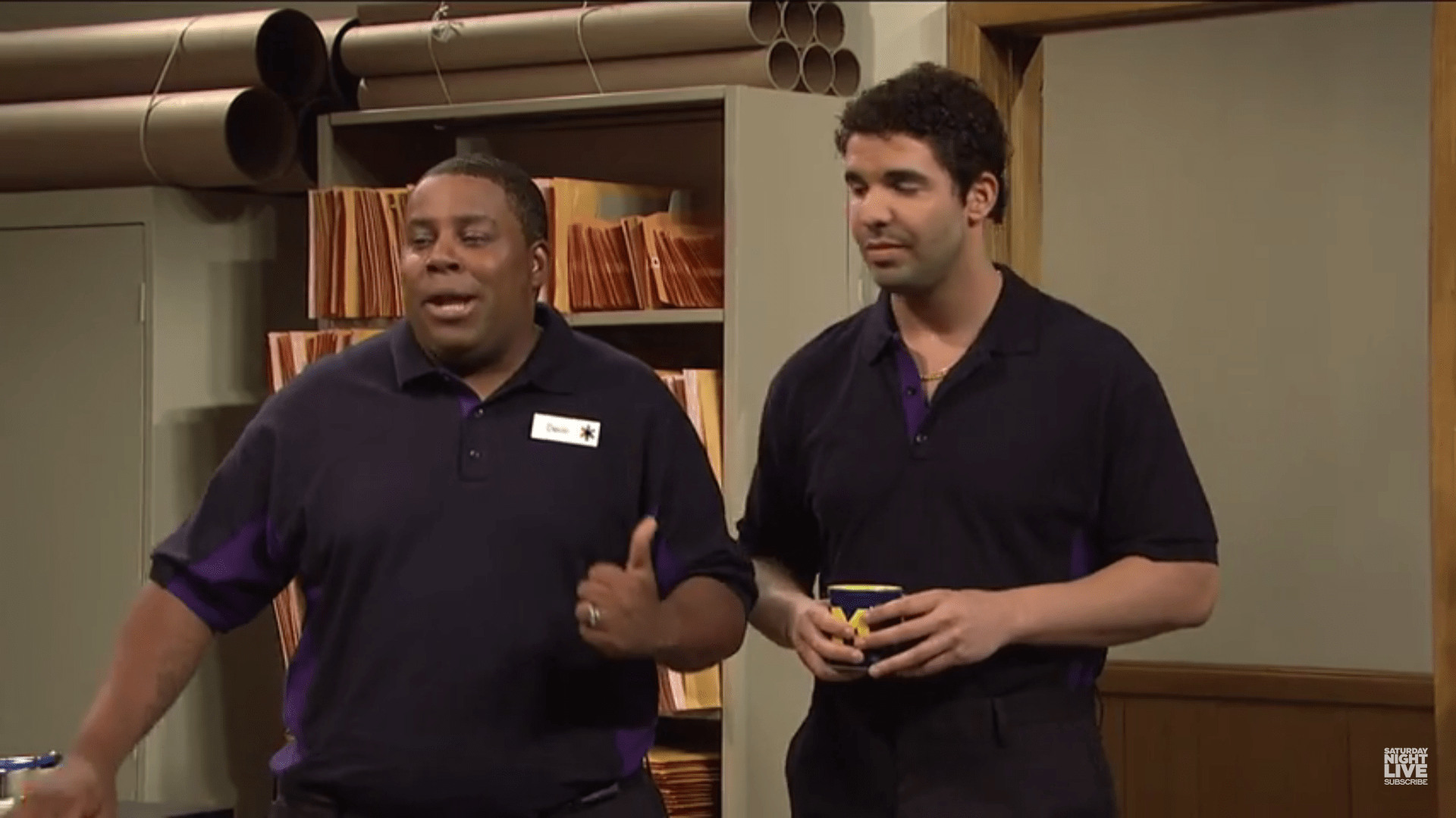 Drake hosted Saturday Night Live for the second time a couple months ago. He oh-so-fittingly sang about memes and played a little black Jeopardy! in the episode, but not everything they wrote for Drizzy made it to the air. In this dress rehearsal sketch cut from the live show, he stars as Derek, a new employee at office store Kinko's, who's getting some gentle, passive-aggressive hazing from his co-workers on his first day. It's hard not to think of his wheelchair Jimmy days on Degrassi with the longer wig and clean-shaven face. Check it out.