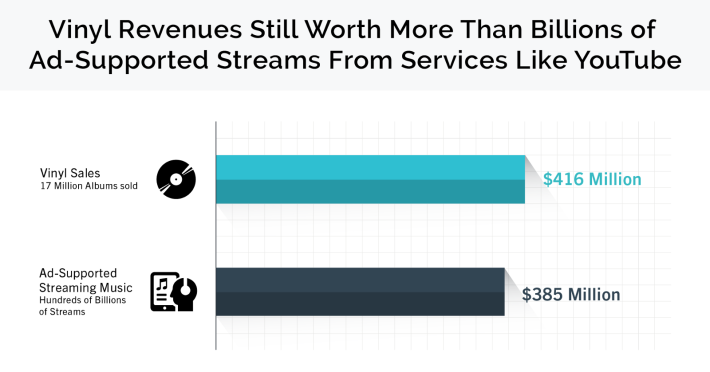 If we extrapolate using Sylvester's math, vinyl sales actually generated about $41.6 million in 2015, which is approximately 11 percent of the $385 million generated by on-demand free streams -- which seems, y'know, not wildly out of line for "a legacy format enjoying a bit of a resurgence," right?