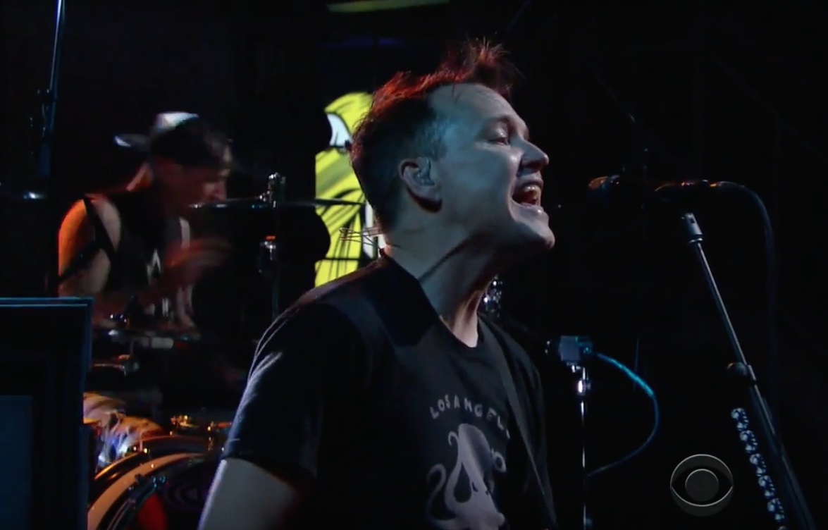 After scoring a #1 album and finally ending Drake's interminable run atop the charts, '90s pop-punk kings Blink-182 took a victory lap last night, doing musical-guest duties on the Late Show With Stephen Colbert. On the show, they played "Bored To Death," the arena-punk first single from their new album California, and they sounded great! For some reason, I never realized how much of his old band Alkaline Trio the new member Matt Skiba brought to that song until I heard that live version. It turns out to be one of those excessively-produced rock songs that sounds better without all the studio effects. And as an online bonus, they also trotted out their 1999 mega-hit "What's My Age Again?," which still rules even though the band members are emphatically not 23 anymore. Check out both performances below.