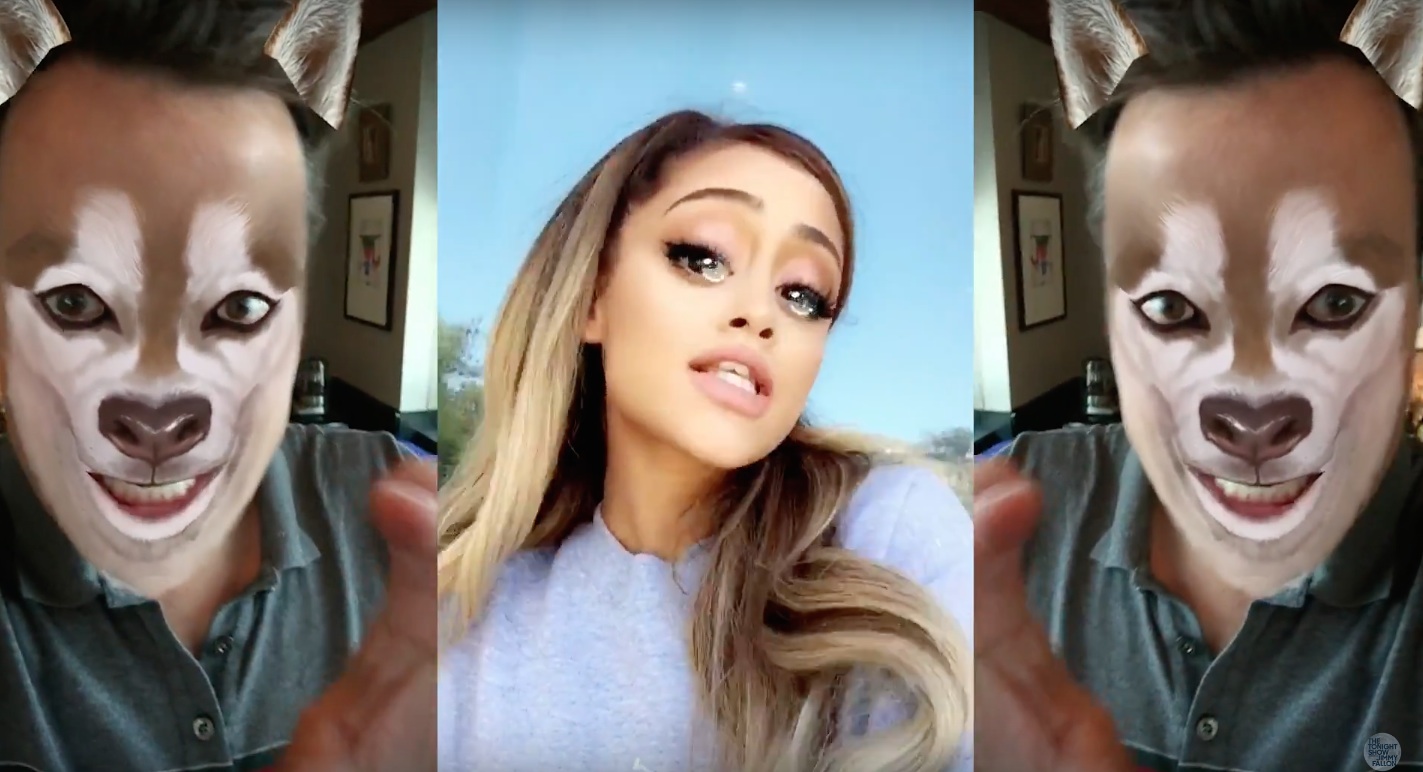 Young pop queen Ariana Grande already had a video for "Into You," probably the best of the singles from her new album Dangerous Woman. But one video wasn't enough. And on last night's episode of The Tonight Show, she teamed up with Jimmy Fallon to make another. This one was decidedly more low-budget: Just two people lip-syncing the song while using every goofy-ass Snapchat filter they could find to make themselves look ridiculous. This is actually the second Snapchat-filter-based late-night comedy bit Grande has done, following her Snapchat horror movie on Kimmel. Is she famous for using a lot of Snapchat filters? Is that a thing? I was born in the '70s, and I only barely know what Snapchat even is. Watch the video below.