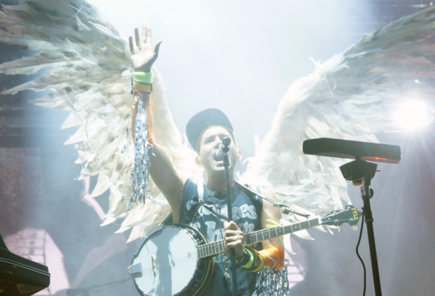 Sufjan Stevens walked on stage with angel wings attached to his back, he and his bandmates dressed in black and yellow outfits that my colleague Tom later described as TRON: The Musical, and began singing the apocalyptic folk-rock title track from 2004's Seven Swans. It is a song that demands spectacle, blooming from eerie quiet to horrifically majestic bombast, and spectacle is exactly what Sufjan and company delivered: explosive post-rock clangor, Sufjan's arms and wings stretched out under the spotlight, a swirl of heavenly sights and sounds that sent tingles through my entire body. Not every attempt at stagecraft worked out so well -- near the end he wore a crown made of balloons and a gigantic shiny silver costume and nearly plummeted the whole show into sub-Flaming Lips quasi-posi glitter-encrusted cheese -- but for the majority of his career-spanning set, the band's playful and colorful look took a backseat to the beauty of Sufjan's catalog. His performance was a reminder that he's one of the most accomplished songwriters of his generation, able to knock you out with hushed ballads about death and ebullient road-trip sing-alongs alike. --ChrisSufjan Stevens closing out #p4kfest last night. Such a magical set.