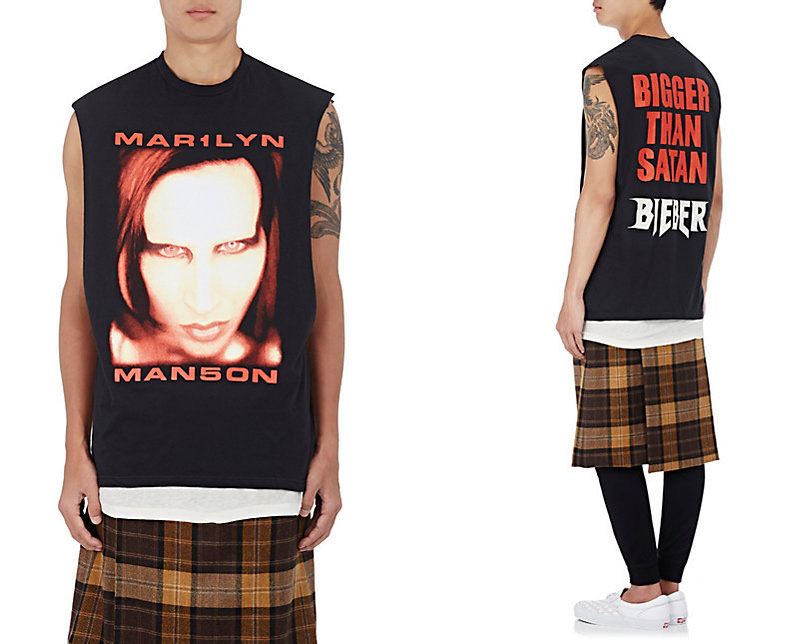 Justin Bieber has lately taken to dressing like a '90s teenage dirtbag, especially on tour, and hopefully we can all agree that this is just an awesome development. He's also been selling some crazily expensive tour merch, much of it designed by the fashion label Fear Of God. His latest piece of apparel, now available at Barneys, is a reconfigured Marilyn Manson t-shirt being sold as the "Bigger Than Satan Bieber" cotton sleeveless t-shirt. The tee (which Biebs wore onstage at MSG last night) is literally just a straight-up Marilyn Manson shirt, except that it says "Bigger Than Satan Bieber" across the back. It's selling for $195. You can buy it here, if you're interested. Meanwhile, a nearly-identical Marilyn Manson shirt is retailing at Hot Topic for $16.72; broke Bieber stans (or Marilyn Manson fans, or '90s teenage dirtbags) can buy that one here.