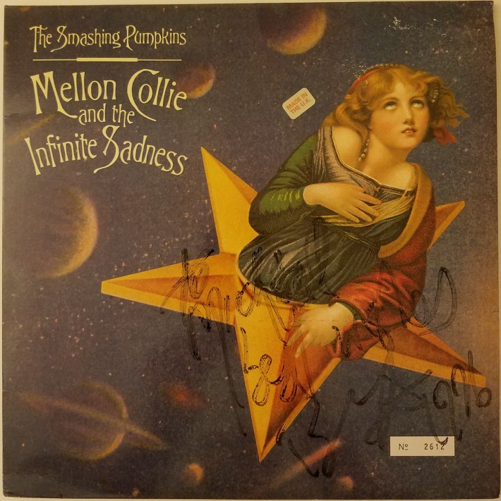 That seems like a silly, self-evident thing in 2016, because in 2016, you can't have a record store without vinyl. CANNOT, end of story. But in 1996, it wasn't necessarily a given. As it happens, though, we did sell vinyl -- our customer base included a lot of obsessive collector types and club DJs and wealthy Europeans who were hunting for bizarre Bowie artifacts, so we actually specialized in vinyl. I told Corgan as much, so he ditched his girlfriend who had wandered into some store or something (not kidding; he said, "She'll find me"; this was pre-cell phone era) and walked back to Rebel with me. He bought a stack of singles, and I pulled an LP off the wall for him to sign. Needless to say, I still have it.