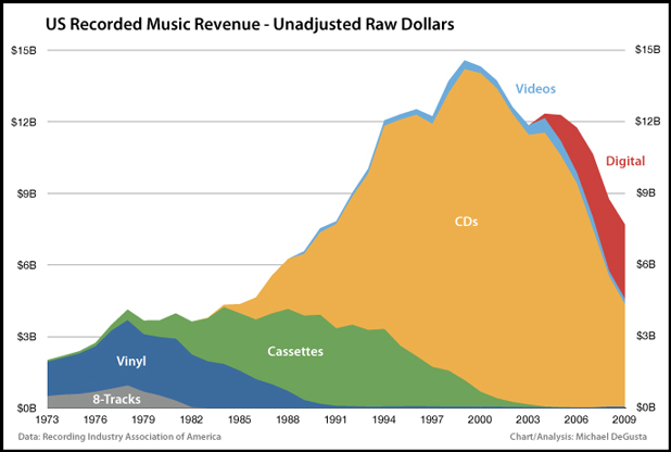 I'm not kidding about the Golden Years thing; my time at Rebel coincided exactly with the US music industry's peak moment, and when I finally left -- to get a real job -- the arrow made an abrupt downward turn. Here, Business Insider made a chart. Just look at all that gold.