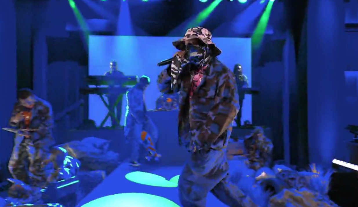 Yesterday, A$AP Rocky was in the news for saying some really, really stupid stuff in an interview. So it's nice to be writing about him doing something cooler: Giving a memorable, intense performance with his A$AP Mob crew on The Tonight Show. This was their first time performing on TV as a full group, though it would be weird to call it their TV debut. On a specially-designed set full of boulders and plants, they did their posse-cut A$AP Yams tribute "Yamborghini High," while the Roots backed them up. They wore fatigues and face masks and brought a fun, chaotic energy that you don't often see in TV performances. Check it out below.