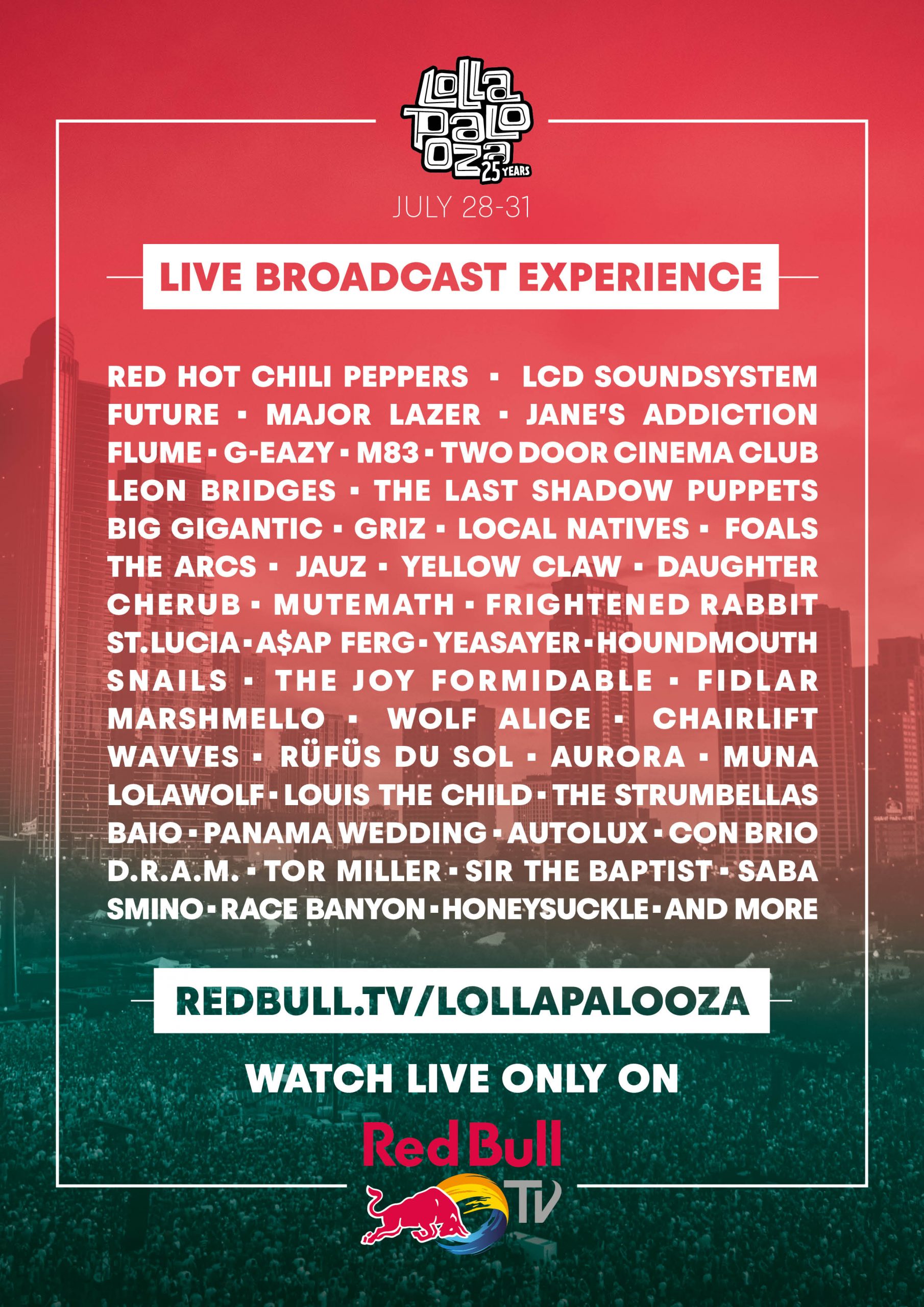 Lollapalooza is celebrating its 25th anniversary this weekend, featuring this year for the first time an additional fourth day of music in Chicago's Grant Park. Artists set to perform include headliners Radiohead, Red Hot Chili Peppers, LCD Soundsystem, and J. Cole as well as Future, Lana Del Rey, M83, HAIM, Chris Stapleton, Local Natives, the 1975, Alessia Cara, Modern Baseball, Danny Brown, Kehlani, Joey Purp, Saba, and a truly staggering amount of further names. It's an overwhelmingly massive lineup, one that's going to keep attendees constantly on their feet to try and catch even a glimpse of everything the festival has to offer. But even if you aren't attending Lollapalooza this weekend, you can still watch a number of the artists via the Red Bull TV livesteam (plus that way you won't have to leave your couch). The livestream will run from Thursday to Sunday, and features select performances detailed in the schedule below. All times are CDT.